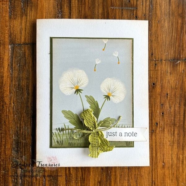 Just like with the 6″ x 4″ pieces, I started off simple. I added a mossy meadow mat (3-1/8″ x 4-1/8″), a greeting and some ribbon wrapped with twine.
