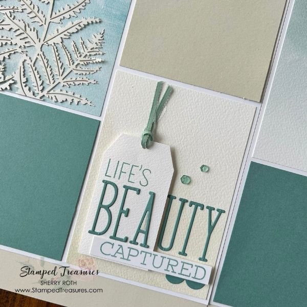 I just loved the envelopes so much I had to find a way to incorporate at least one of them. So I fussy cut the fern patterns from the basic beige envelope. These were add to the lower left and upper right corners of the layouts. They are subtle but a great addition.