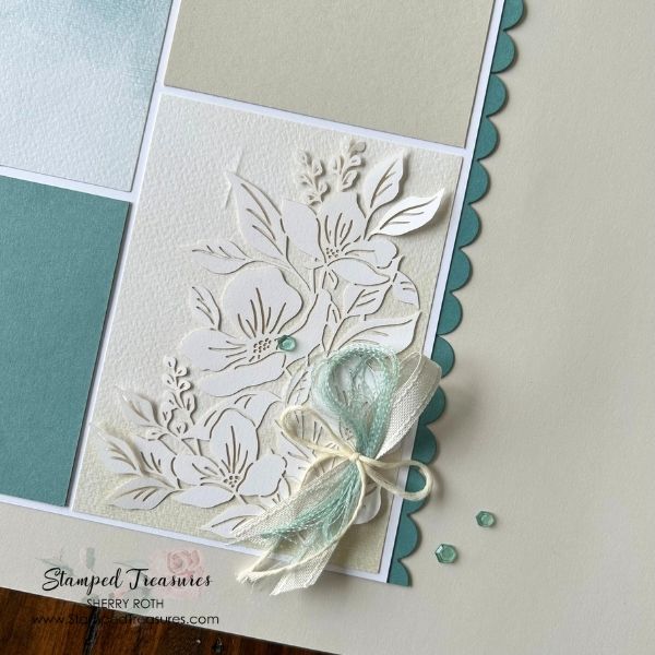 To dress up this simple layout, I used the circle die from the Loving Arrangements die to create a scallop border on both pages.