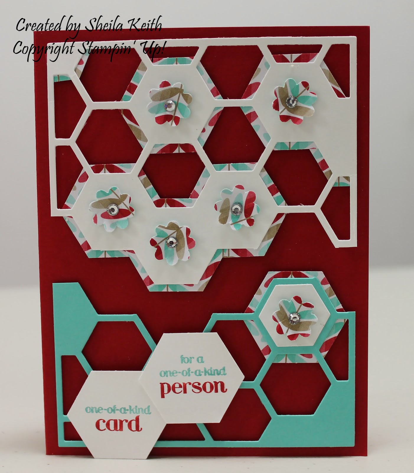 This card is Sheila Keiths. I love how she separated the hexagon hive thinlit and then added the punched hexagons in behind. What a great way to use the two together!