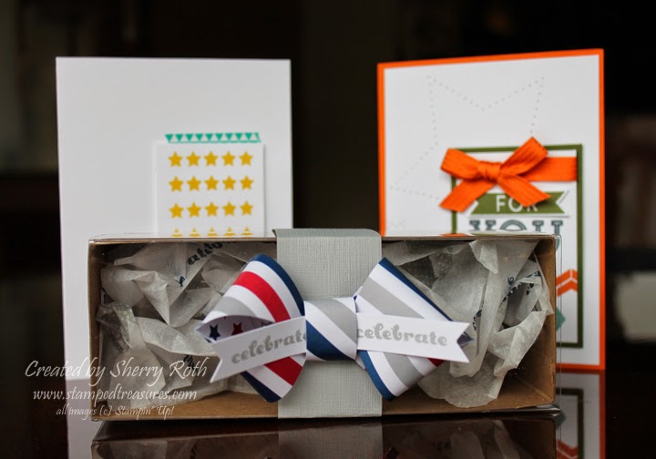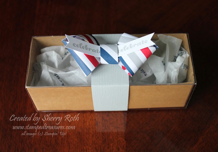 Stampin’ Up! shared how to create an adorable bow out of the pinwheels so I added it to one of our Tag a Bag Gift Boxes. Super simple – I whipped up a couple of these in no time at all. I even used previous My Paper Pumpkin exclusive stamps to stamp the tissue paper.